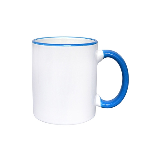 White ceramic mug with matching blue handle and rim. Mug Size: 9.7cm height by 8.2cm in diameter. Mug Capacity: 330ml. Comes packaged in a card box.